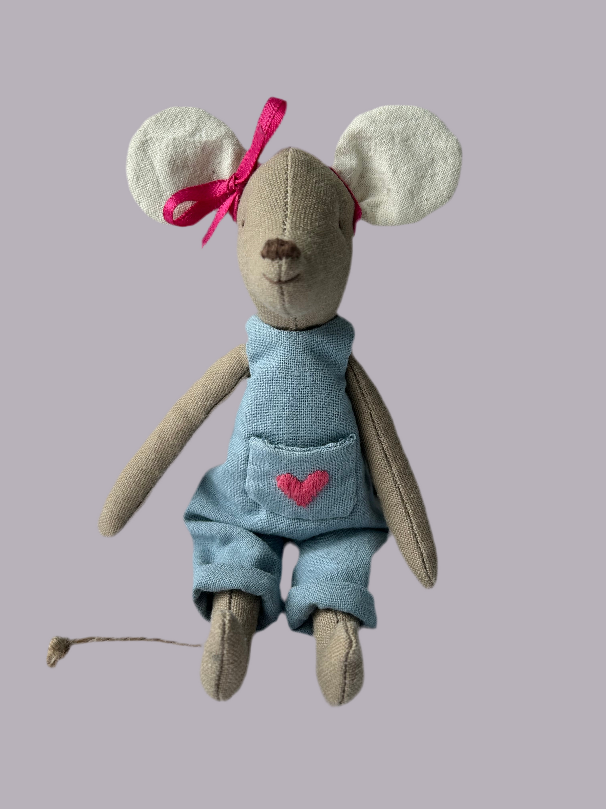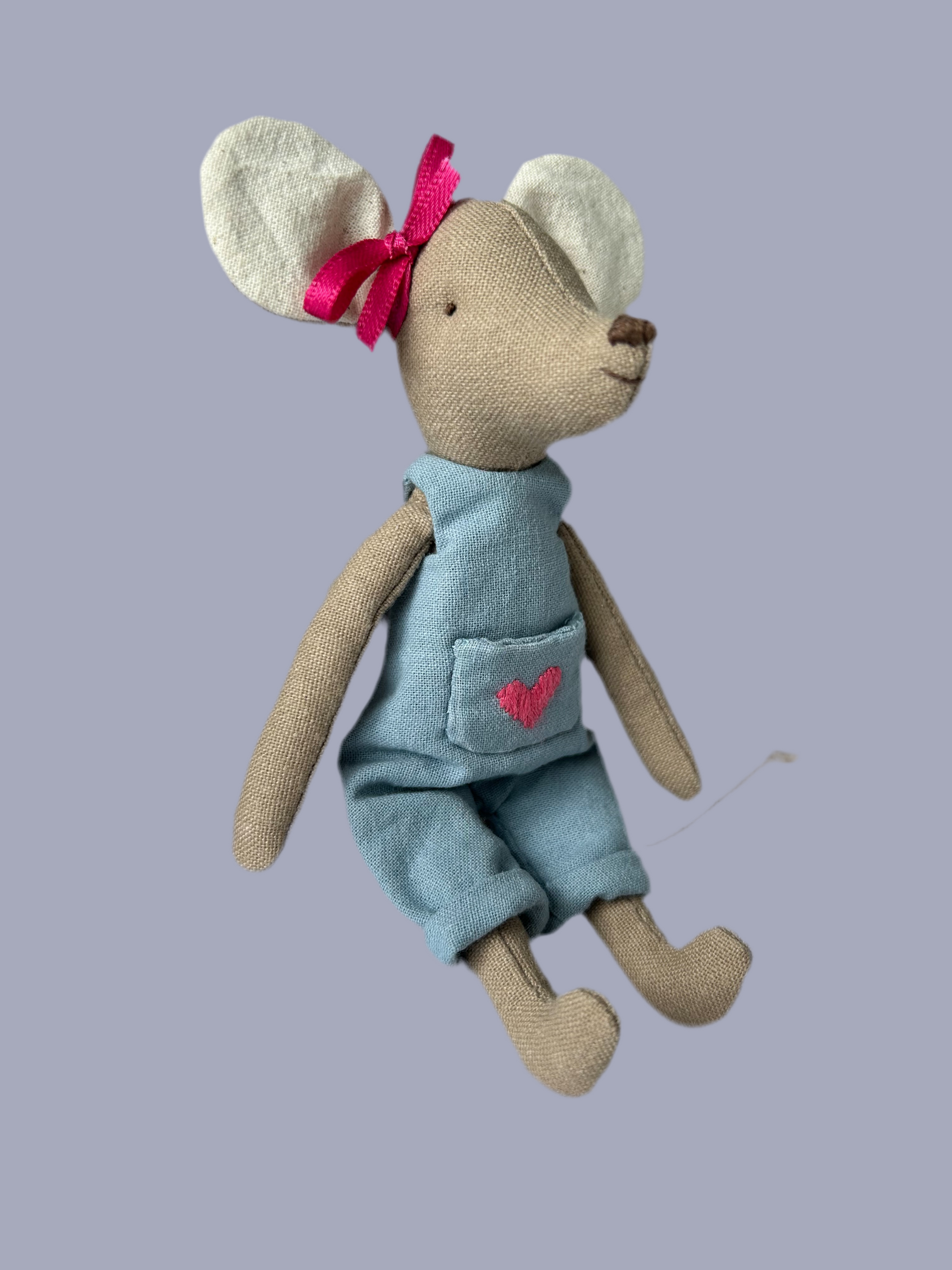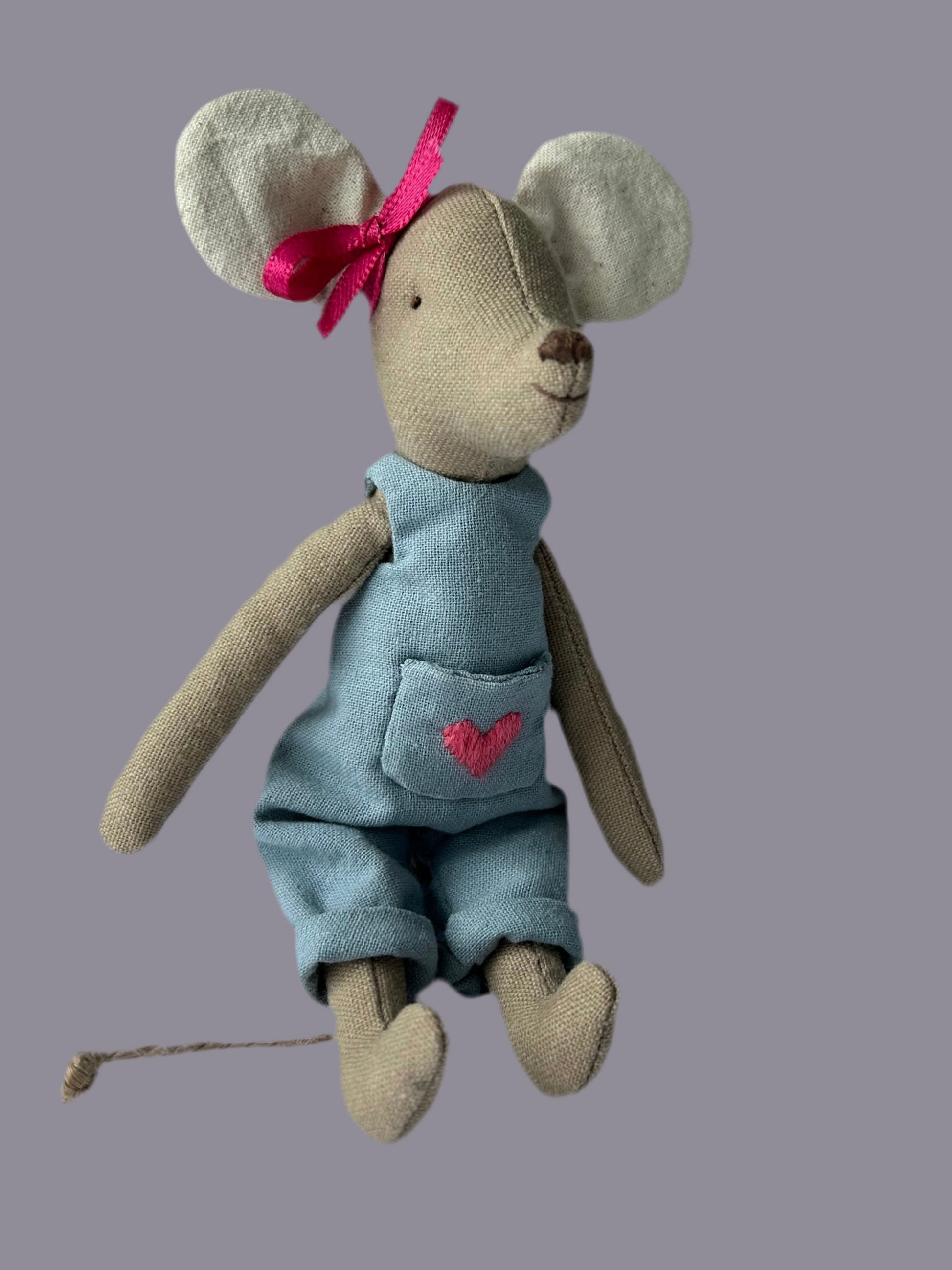 Materiales: cosida con hilos fuertes de buena calidad. Su cuerpo es de tela premium de algodón con lino, su jumpsuit es de tela de lino y algodón. Nina tiene un lacito fucsia y también una colita de hilo de mecate, que si se prefiere se puede guardar entre la ropa.